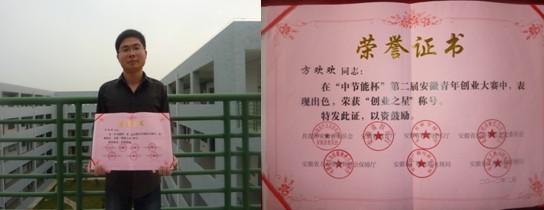 由共青团安徽省委员会、安徽省教育厅、安徽省科学技术厅、安徽省经济和信息化委员会、安徽省人力资源和社会保障厅、安徽省广播电影电视局、安徽省工商行政管理局七家单位组织主办的“中节能杯”第二届安徽青年创业大赛,大赛对象为全省18-38岁有志创业或已经创业的青年,我院经济贸易系积极组织和准备,有2010级电子商务专业方欢欢、左梦茹、曹孝俊、顾江峰同学组队在徐奕胜、程飞、余锋老师精心指导下,以“新阳光科技服务有限公司”的网络推广和运营,方欢欢同学荣获“创业之星”殊荣。