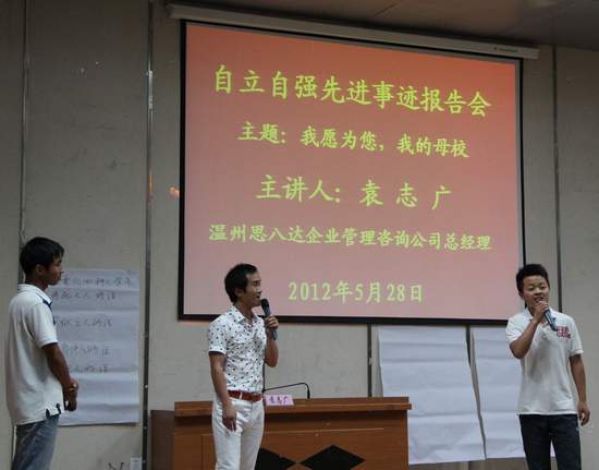 5月28日晚,我院首届毕业生、温州思八达企业管理咨询公司总经理袁志广回母校作自立自强事迹报告会。报告会由学生处副处长彭金德主持,来自全院各系部的600余名学生聆听了报告。