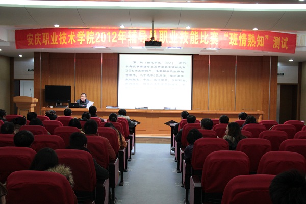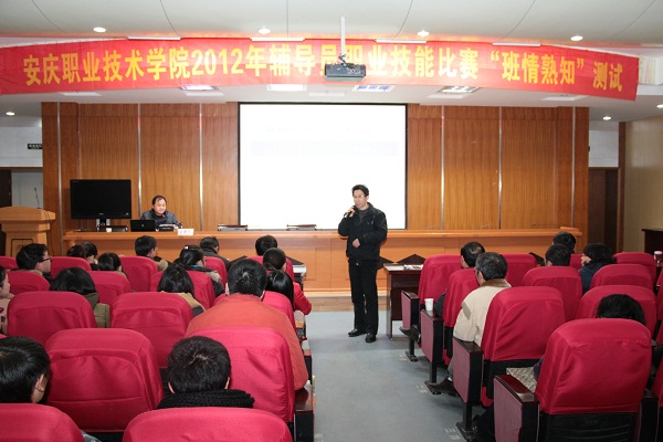 12月19日下午,首届辅导员职业技能大赛“班情熟知”测试在图文信息中心学术报告厅如期举行。副院长毕明生教授现场观摩指导,相关处室负责人、各系分管学生工作负责人、班主任辅导员以及一百多名学生代表观摩了此项比赛。