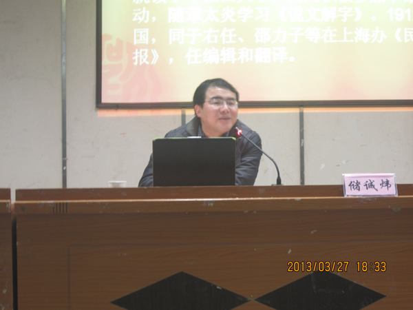 3月27日晚,储诚炜博士在图文信息一楼报告厅作“国学大师刘文典生平轶事”专题讲座建筑工程系500余名师生听取了讲座。