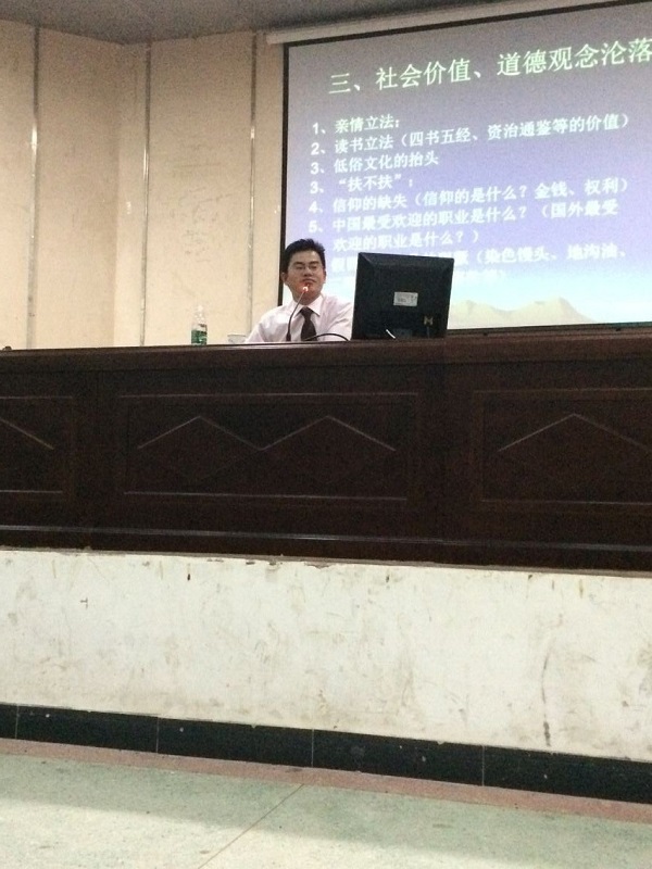 5月28日晚,经贸系朱镇斌老师在图文信息中心一楼报告厅作了题为《当下中国十大社会经济热点问题及思考》专题讲座。讲座由该系团总支书记陈颖主持,经贸系全体学生到场聆听。 讲座结合现代人生活现状的具体事例,讲述当下中国十大社会经济热点,包括贫富差距、贪污腐败及社会价值观等,而人们尤为关注的养老、医疗及住房的社会保障问题也亟待解决。朱老师的讲解深入浅出、激情澎拜、发人深省,以全新的视角讲解了社会存在的问题及危害性,现场不时报以热烈的掌声。