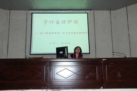 6月11日晚,经济贸易系党总支副书记朱宜娟老师应邀作主题为“拿什么保护你——谈《劳动合同法》对大学生就业的影响”专题讲座。讲座由院团委副书记余锋主持,近600名学生到场聆听了讲座。