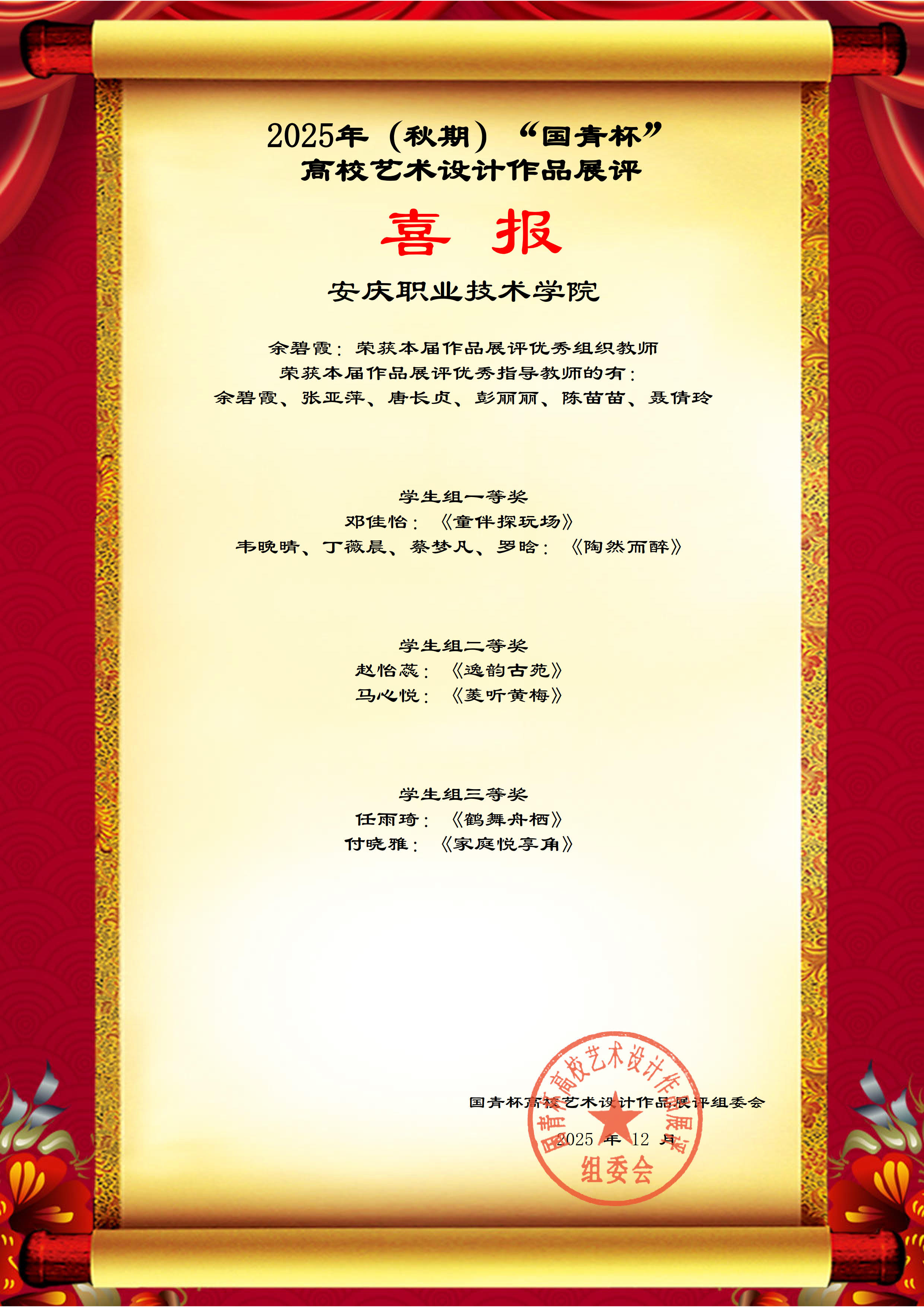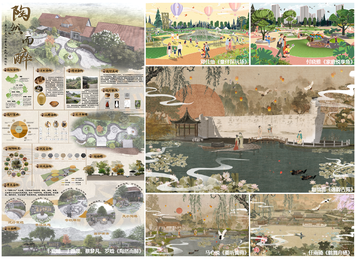 本次征集活动旨在探索艺术设计教育发展新趋势,创新艺术设计人才培养机制,为广大高校师生搭建一个相互交流和提高的平台。经过激烈竞争,我校园林技术专业邓佳怡《童伴探玩场》、韦晚晴、丁薇晨、蔡梦凡、罗晗《陶然而醉》2件作品荣获学生组一等奖,赵怡蕊《逸韵古苑》、马心悦《菱听黄梅》2件作品荣获学生组二等奖,任雨琦《鹤舞舟栖》、付晓雅《家庭悦享角》2件作品荣获学生组三等奖,余碧霞获本届作品展评优秀组织教师,张亚萍、唐长贞、彭丽丽、陈苗苗、聂倩玲等教师获得优秀指导教师。